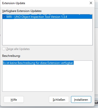 Ein Fehler ist während der Installation der Extension MRI - UNO Object Inspection Tool aufgetreten. Die Fehlermeldung ist: Medientyp konnte nicht ermittelt werden: file:///C:/Users/PC-SCH~1/AppData/Local/Temp/3E4B.tmp_/3E5C.tmp_/4a425d00-08a5-11e9-9a77-0d8bd079b003